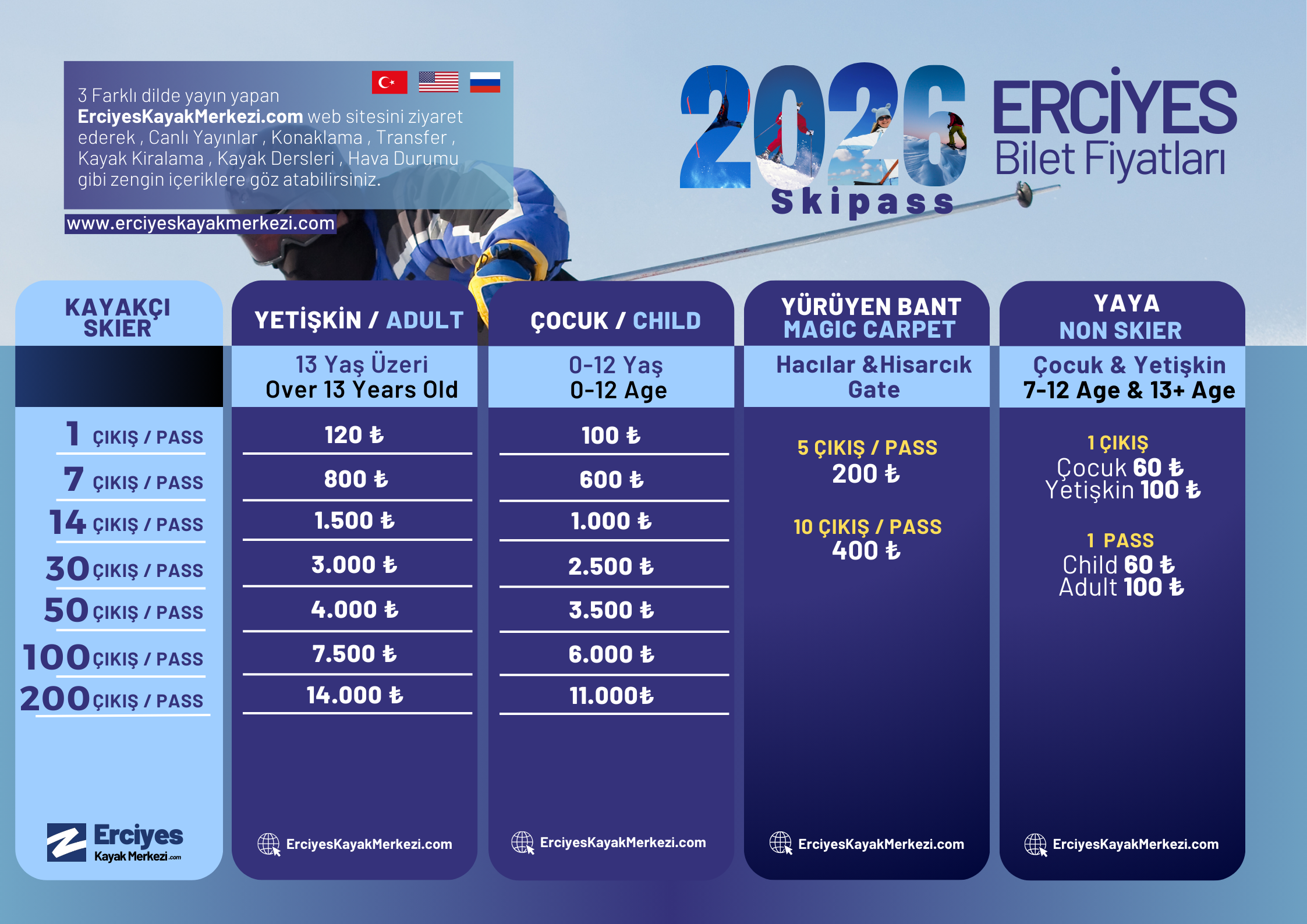 Erciyes Kayak Merkezi biletleri Kayseri Büyükşehir Belediyesi tarafından satılmaktadır.